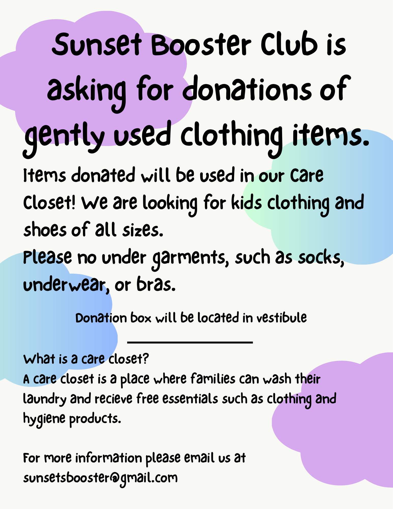 Good afternoon Sunset families, our booster club will be meeting tomorrow in the Sunset Library at 6pm. We will be discussing our upcoming movie night as well as the Care Closet that we are opening...